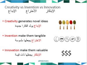 الابتكار هو إيجاد فكرة جديدة إيجابية غير موجودة أما الإبداع هو تطوير شيء موجود ومعروف.